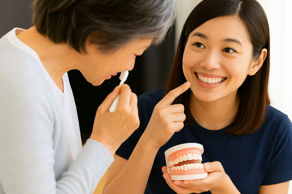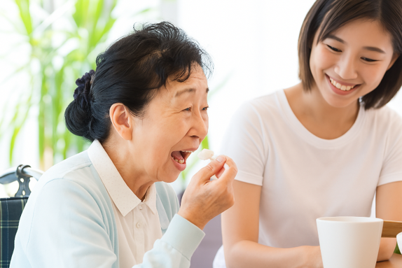 口腔機能低下は、誤嚥及び誤嚥性肺炎と密接なつながりがあります。それを予防するため全員で口腔機能向上トレーニングを行います。