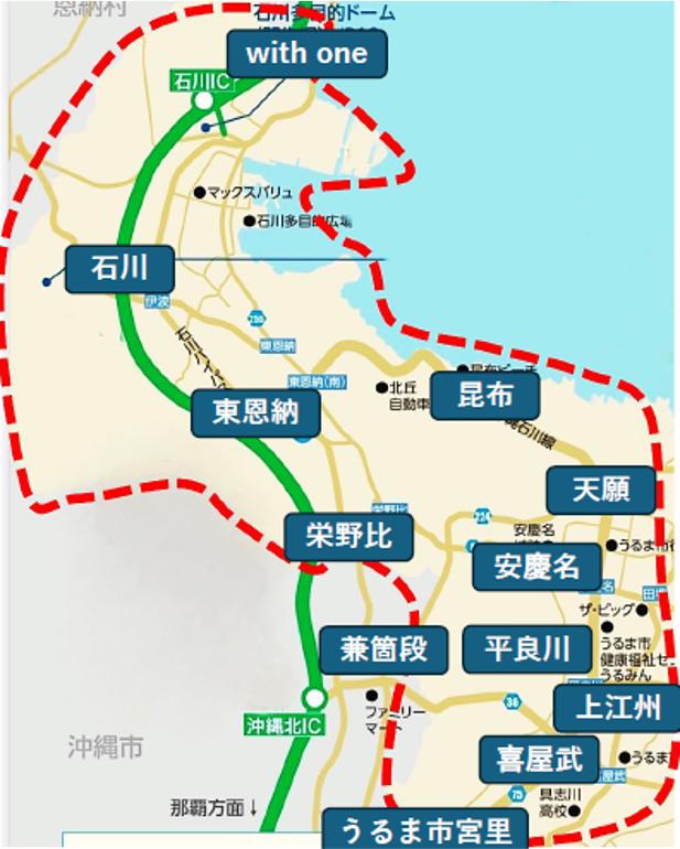 うるま市宮里、喜屋武、上江州、兼箇段から石川方面向け圏内のエリア