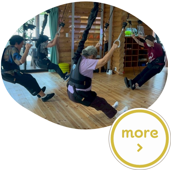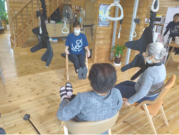 スペースワンダーでのリハトレーニング。利用者様が「やってみたい」個別活動どれもが「やってみたい」を刺激するプログラムをご用意。 自宅での入浴が難しい方へは、個別で入浴対応を行なっています。1人ひとりにスタッフがサポートしますのでご安心ください