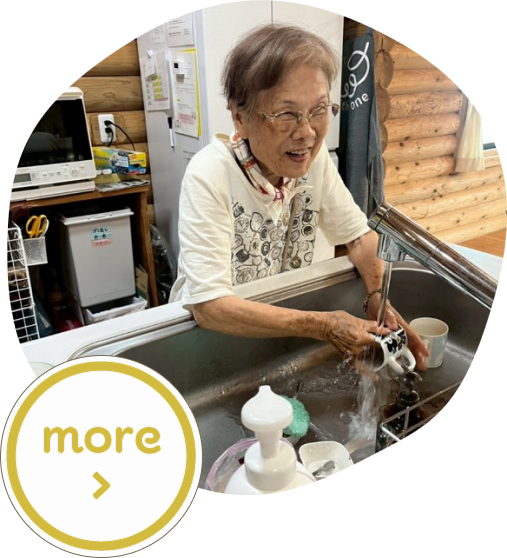 食器洗いや拭きものを、職員と一緒にお手伝いしていただくことも。家事活動を通して生活機能向上につなげていきます。